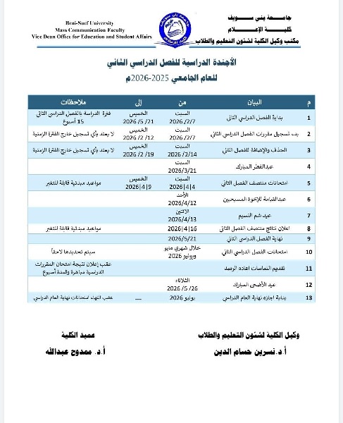 Academic Agenda for the Second Semester of the 2025/2026 Academic Year.