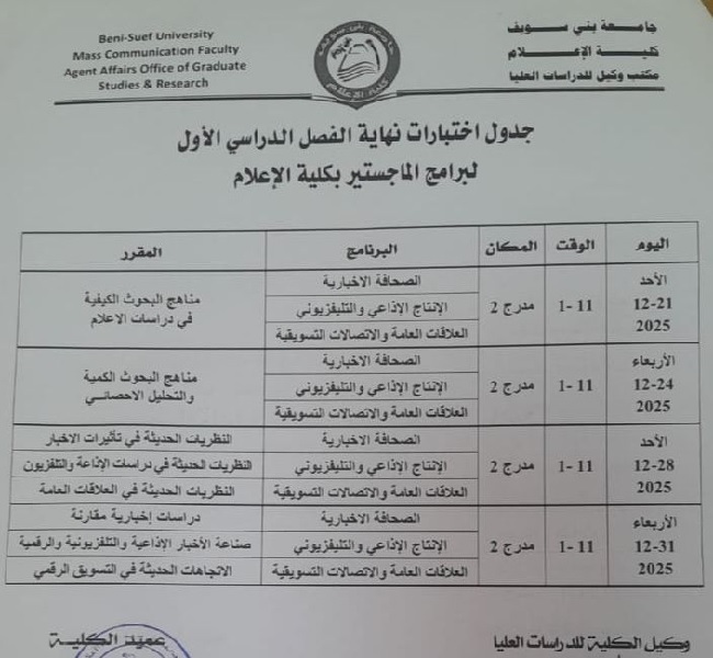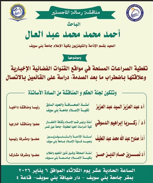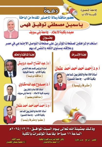 تتقدم أسرة كلية اﻹعلام اﻷستاذ الدكتور ممدوح مكاوي عميد الكلية والسادة الوكلاء وأعضاء هيئة التدريس والهيئة المعاونة ومدير الكلية والعاملين، بخالص التهاني القلبية للسيدة الأستاذة ياسمين مصطفي المعيد قسم الإذاعة والتليفزيون بالكلية لحصول سيادتها على درجة الماجستير في التخصص بامتياز